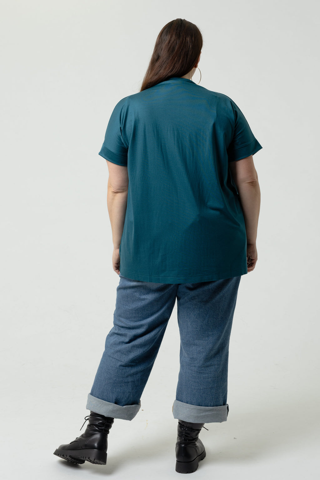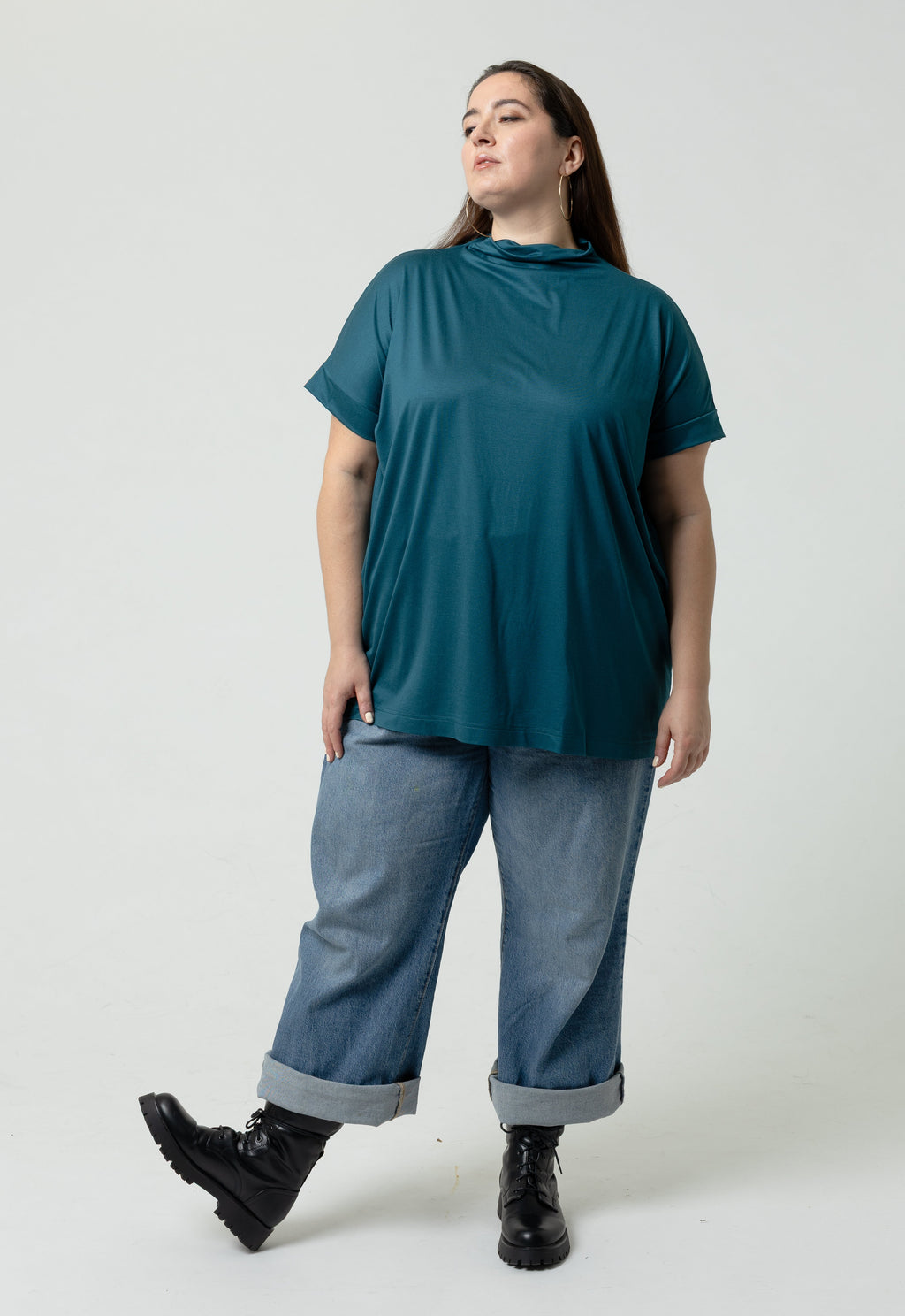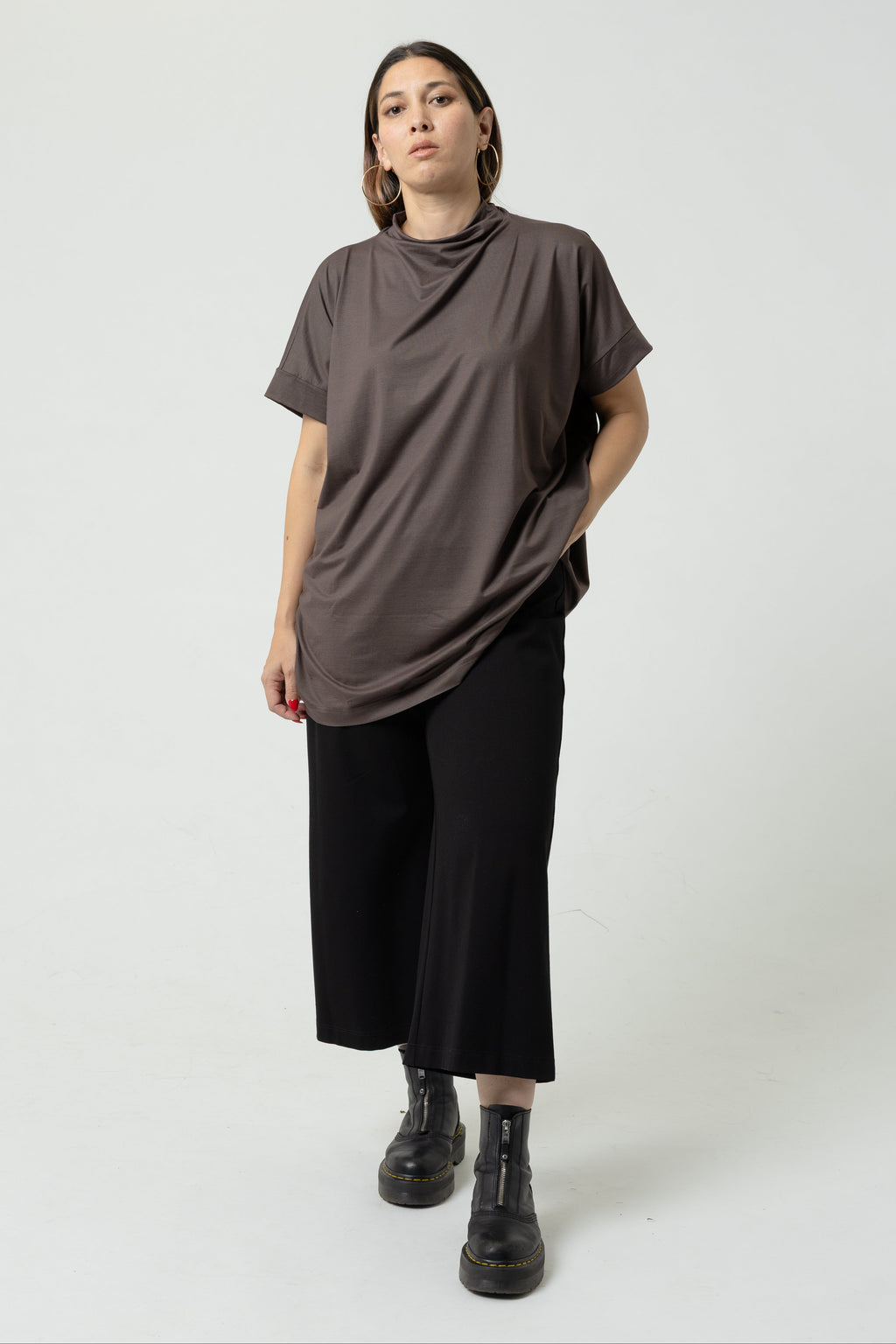 I made this shirt for a fair in Paris for myself, loved it, and decided to put it in the collection. Very loose fit T-shirt, extra wide, extra long with an integrated small mock neck and band sleeves.