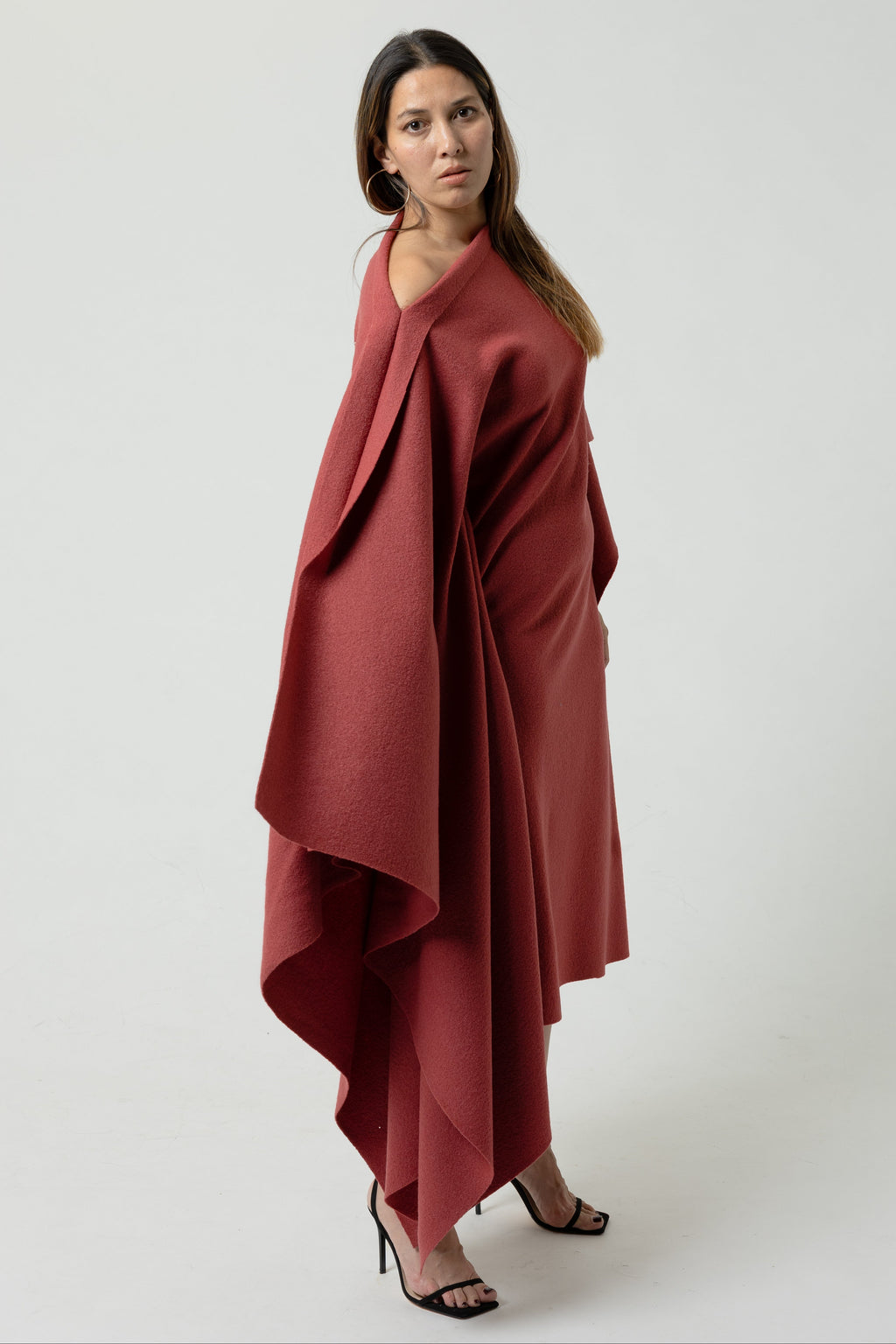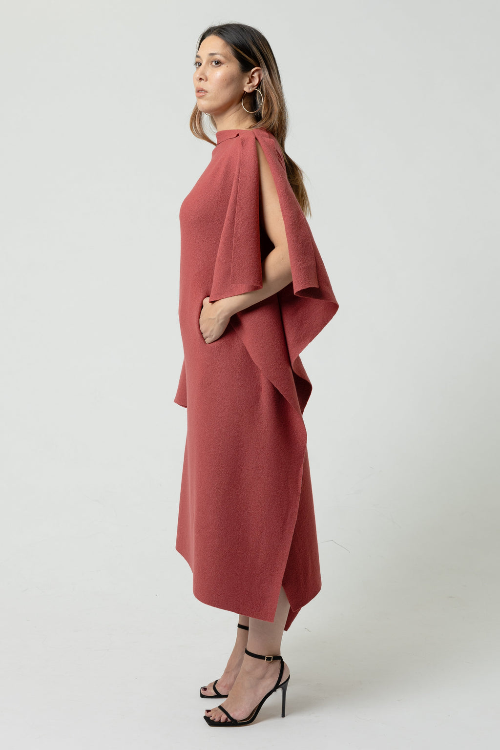 An avant-garde, calf length, asymmetric draped "flat dress". With a bardot neckline and one slip in front side pocket. Made out of a soft luxurious boiled wool.