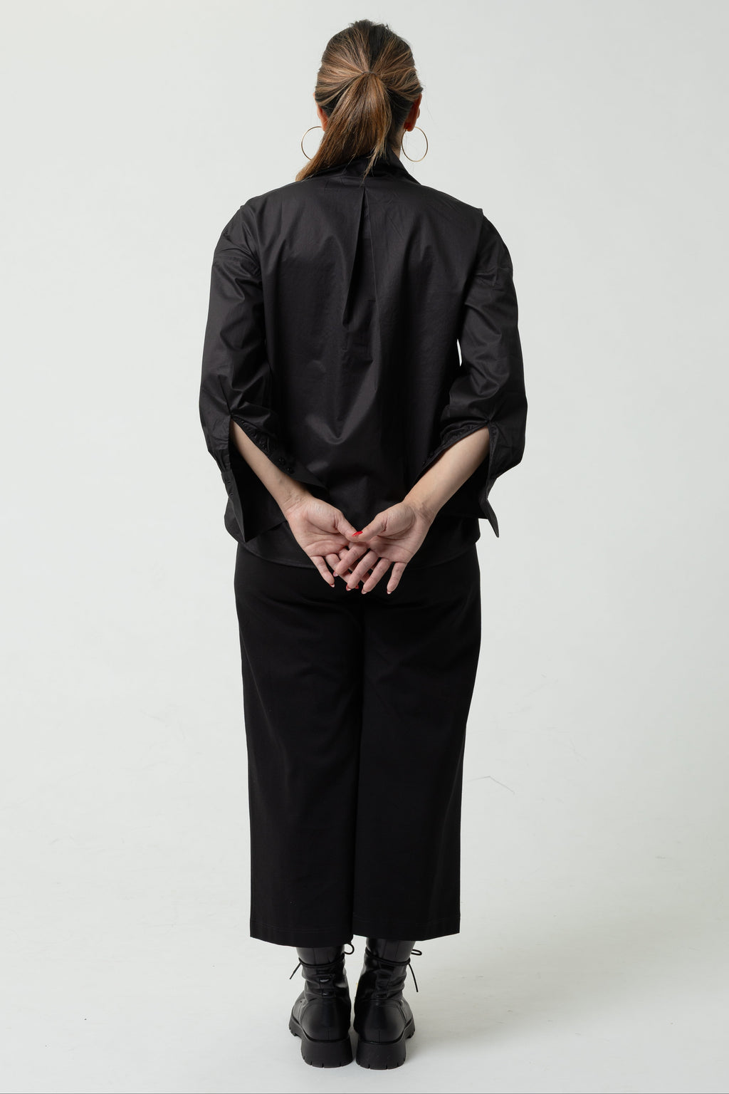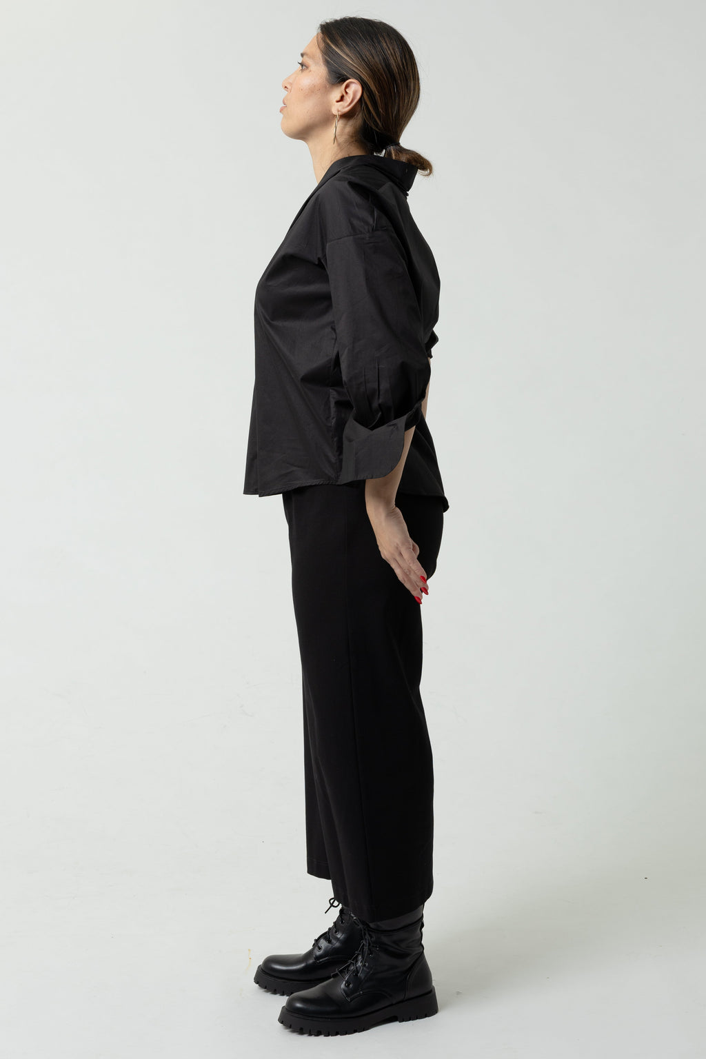 An Asian - reduced to excellence. A fine kimono collar shirt, with a soft, wide, round shoulder line, a center back pleat, round hems, and a tube sleeve ruffled into a wide but classic mans-style cuff.