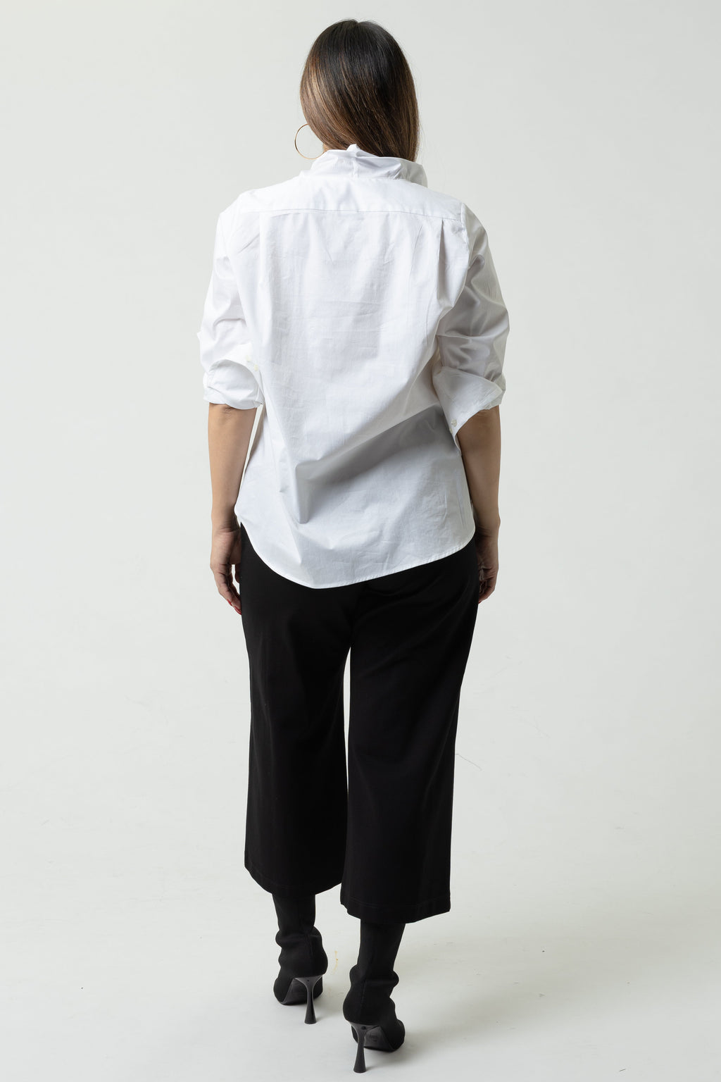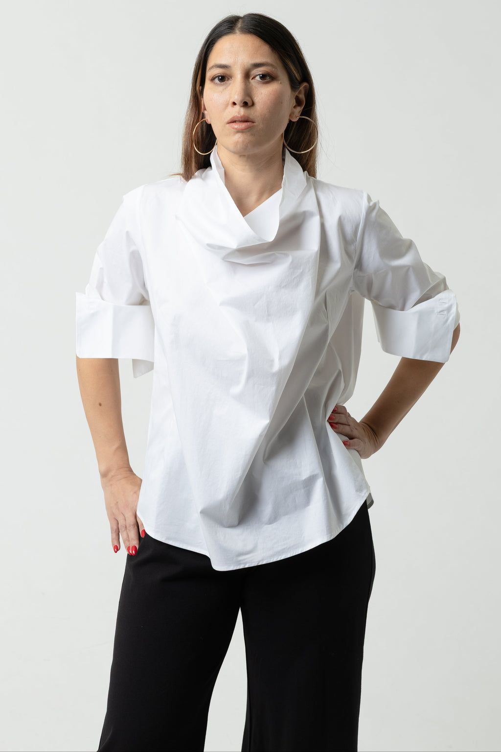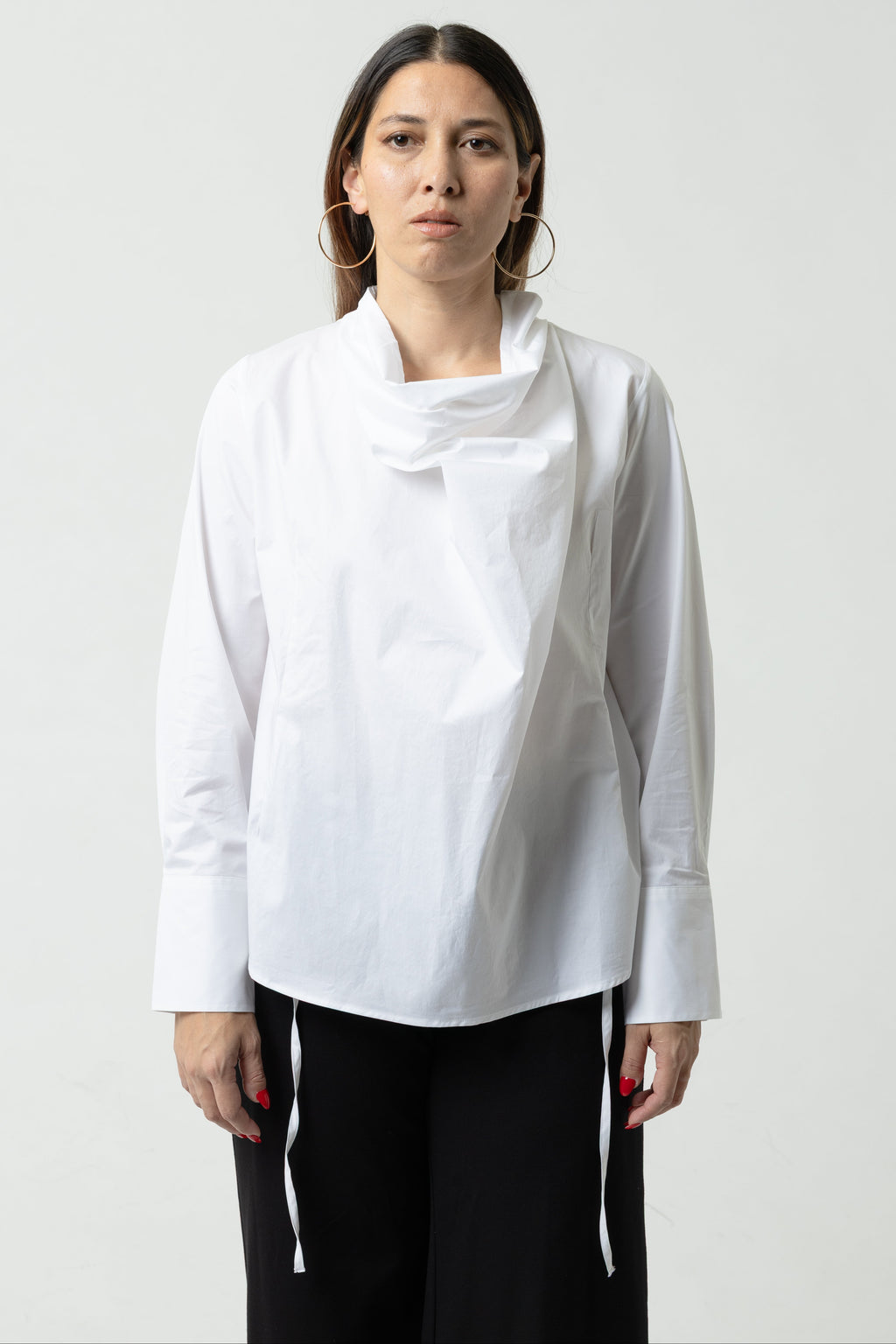 A super reduced form, based on the classic Blouse concept, a light shawl-collar cut in one piece with the Blouse front. It gives an easy yet avantgarde look and feel. Two intern bands direct the draping to a soft hinted waistline, classical sleeves with elegant one button cuffs.